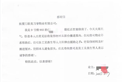 5月9日上午,烏雲密布,一場大雨即将來臨,物(wù)業公(gōng)司突然收到業主求助:因業主出差,剛買的房子正在裝(zhuāng)修,很(hěn)多(duō)裝(zhuāng)修材料堆放在陽台。為(wèi)了避免損失,物(wù)業立即組織相關人員前往搬運,并反饋結果給業主。當業主得知自己的裝(zhuāng)修材料轉移到安(ān)全的地方後,懸着的心終于放下,發來了一份《感謝(xiè)信》。